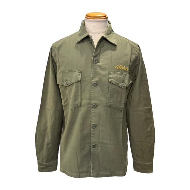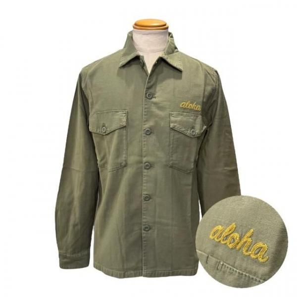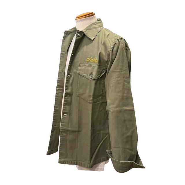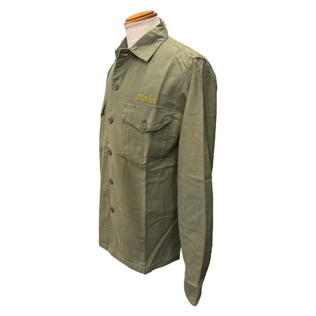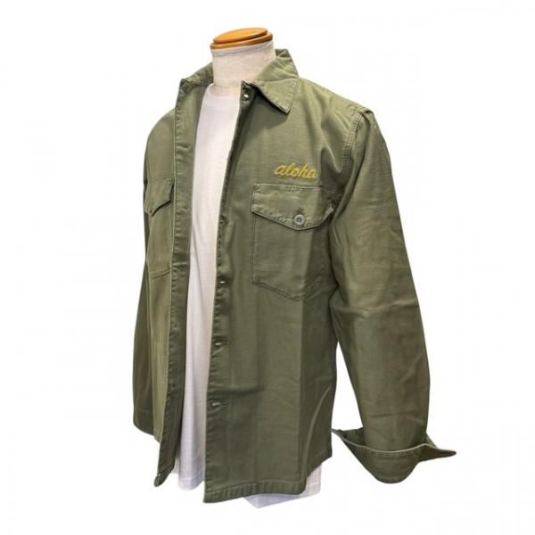 このファティーグもセオリーに則った2つのフラップ付きポケットと専用の練りボタン、そして部隊名や兵士名が施されるポケット上には”ALOHA”の文字が『チェーンステッチ』によって施されています。