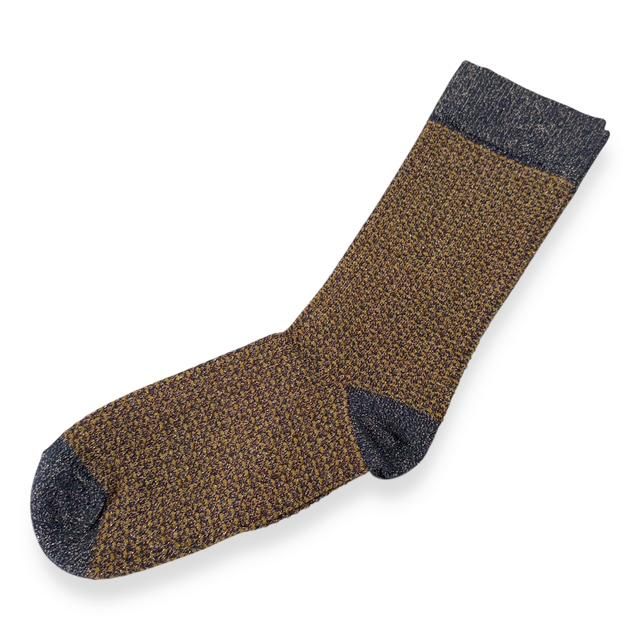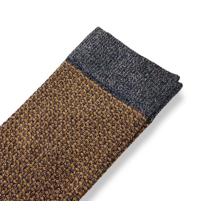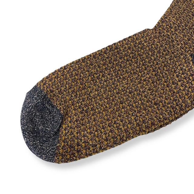 煌びやかなソックス”HONEY”は、ハニカム編をベースにしたクルーソックスデザインで、カーキやブラウン、ネイビー、グレーなどをミックスした編地に、ゴールドのメタリック繊維を織り交ぜ、落ち着きの中に見える豪華さ、足元を美しく飾ってくれる渋みと鈍い輝きによってアクセントを作り出しています。
