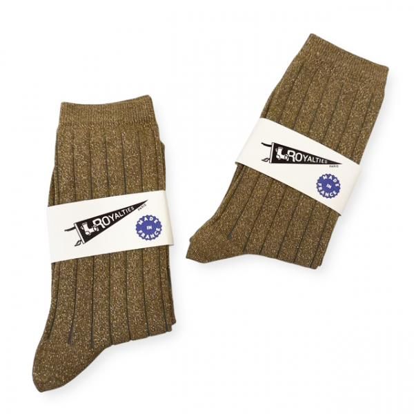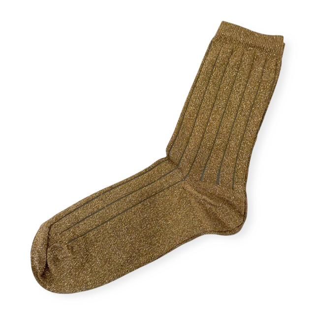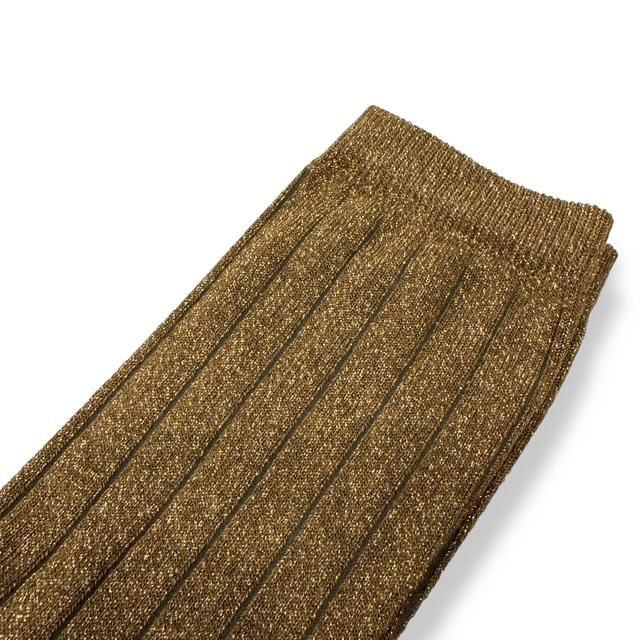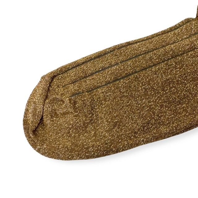 シンプルなリブのクルーソックスをベースにメタリック繊維を織り交ぜ、落ち着きの中に見える女性らしい存在感、足元を美しく飾ってくれる渋みと鈍い輝きがアクセントを作り出します。