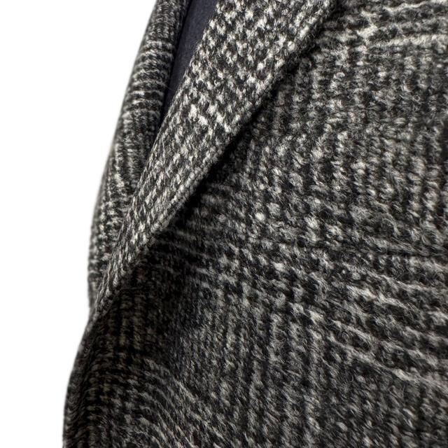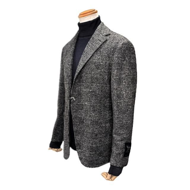 形はシングルの段返り三つボタンがベースで、肩の垂れ綿のみを使用し、その他の副資材を極力省いて仕上げたアンコンストラクテッドなジャケットになっています。
