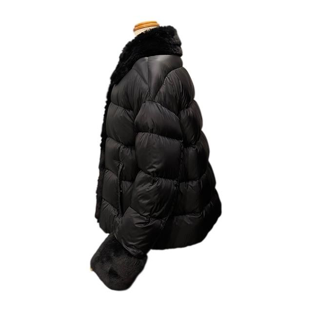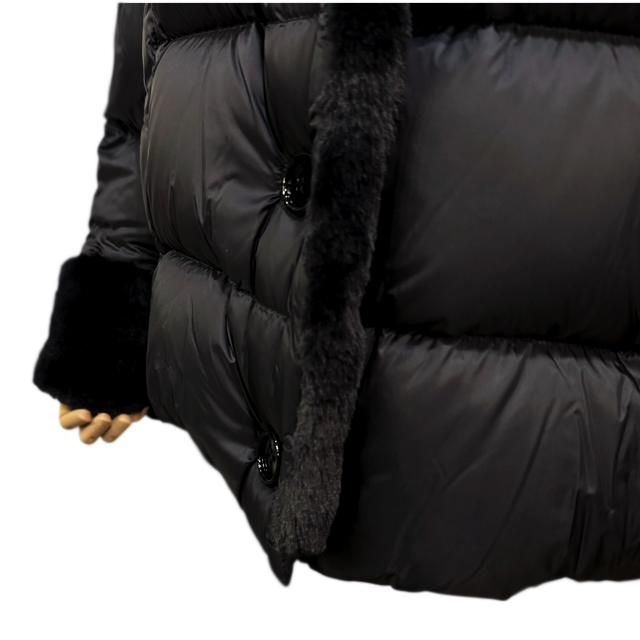 衿と袖、前立て部分にファーを備えたパファージャケットのデザインをベースに、全体的にゆとりを与えたリラックスしたシルエットは、このジャケットの軽さや柔らかさを体感させてくれるデザインで、ハーフコート型である事を考えると、より気軽に、より日常的に使い易い物になっています。