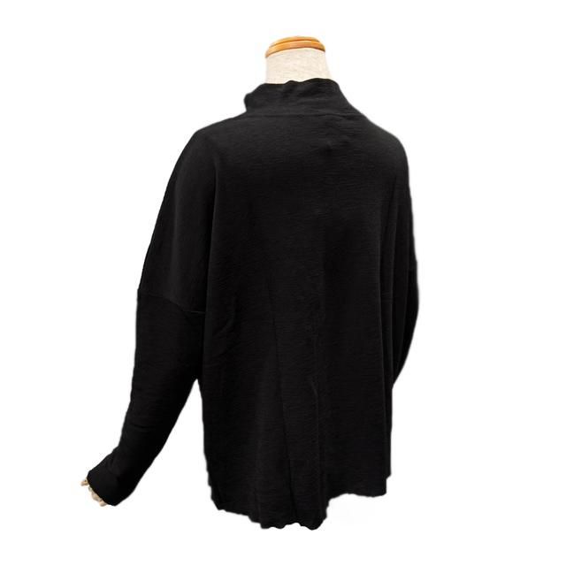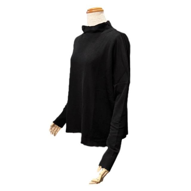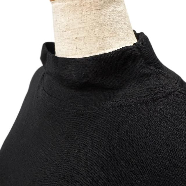 ボディはウールクレープ状で、衿は袋二重の作りで仕上げている為、通常ハイゲージのニットをインナーのした時に感じる「アウターとのボリュームの差」を感じることがなく、衿回りにしっかり存在感が作られる分、コーディネートがし易くなる特徴が有ります。