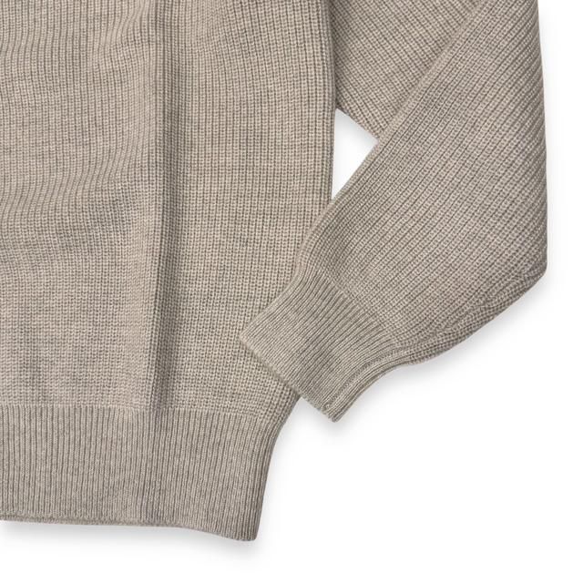 片畔の編地は目が細かく、エクストラファインメリノの糸を「ここまで厚みを持たせて編んでいる」ことを改めて感心してしまうほどで、ボリューム感、着心地、触り心地、全てに満足の行くマストハブの一着です。