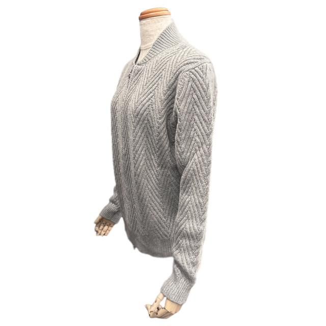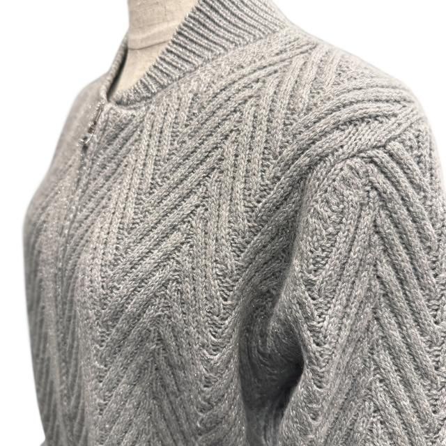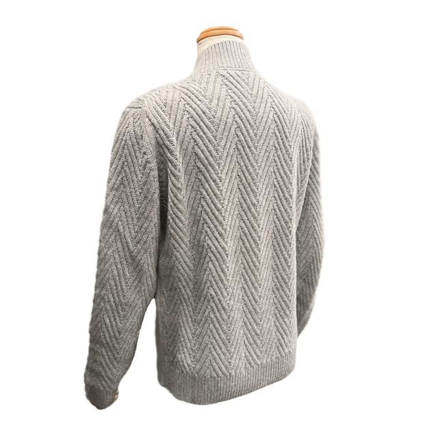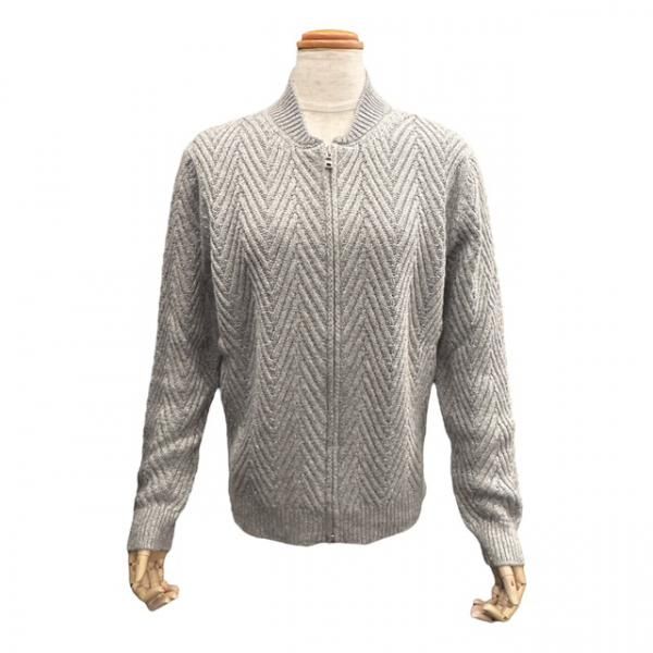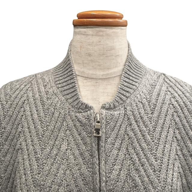 このニットジャケットもまさに高い技術の結晶で、デザインはニットで表現されたブルゾン、しかしその編地は一つ一つが丁寧に編みこまれた大きなヘリンボーン(杉綾)編みで、美しい発色のグレーの糸には非常に極微なシルバーのメタリックフィルム糸が織り込まれています。
