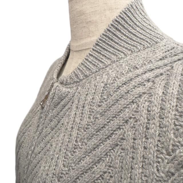 このメタリックフィルムは最近様々なニット製品で取り入れられている糸で、昔のようにチクチクするような糸ではなく、柔らかさと滑らかさのある特殊な糸が使われており、ベースの糸の柔らかさと弾力性を損なうことなく、非常に心地良い肌触りを作り出しています。