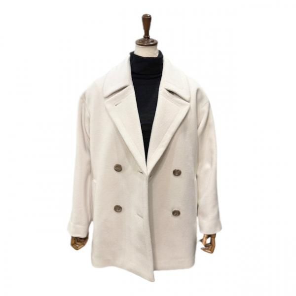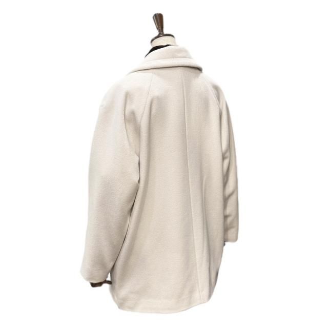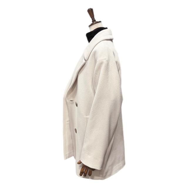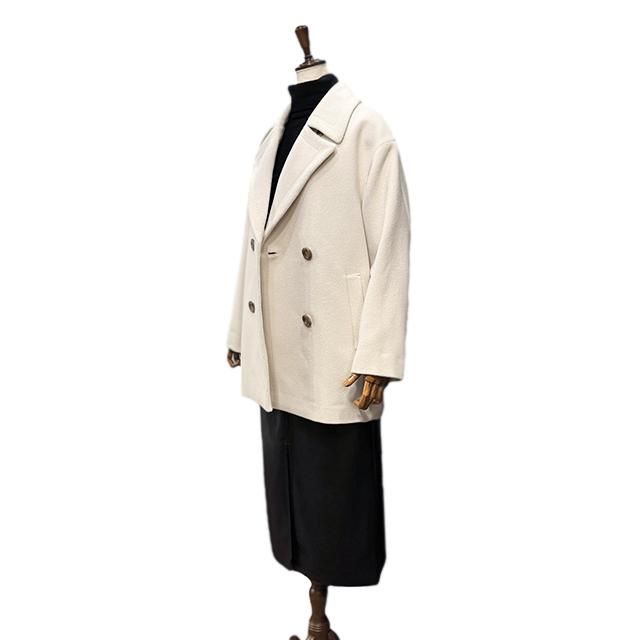 デザインはピーコート型ですが、表現するならば、ダブルブレステッドのコートをヒップ下辺りの着丈で仕上げたハーフコートサイズと捉えられる、女性らしさとメンズライクなデザイン性が融合された、如何にもDRAWELLらしいデザインです。