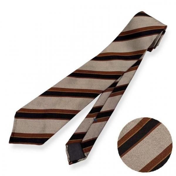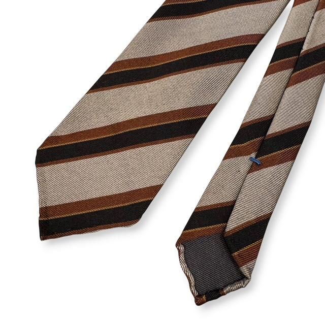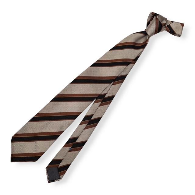 彼の作るタイの特徴でもあるパネルのレジメンタルではなく、太さの異なるストライプを並べ、素材にシルクカルゼを横使い(通常は斜めの綾になっています)にする事で、立体感のある独特な表情が作り出されています。