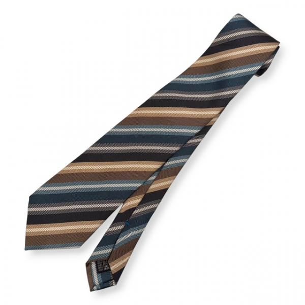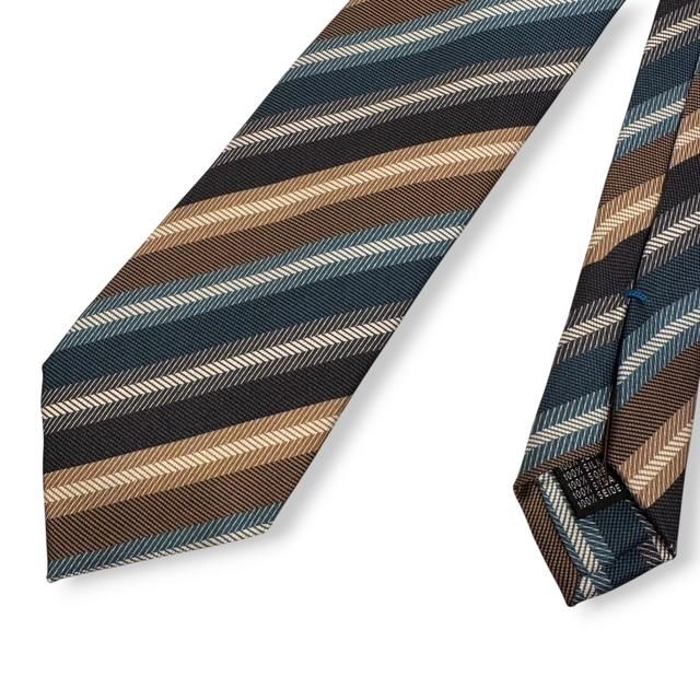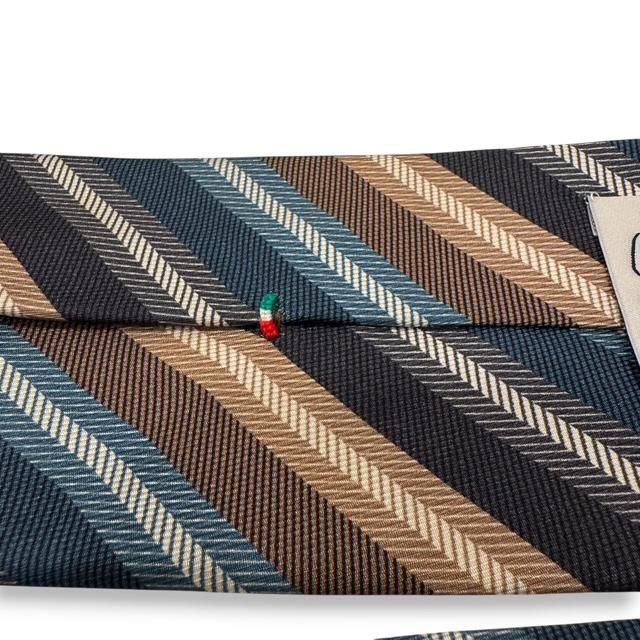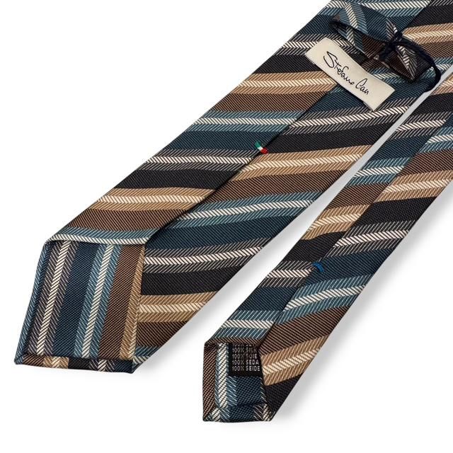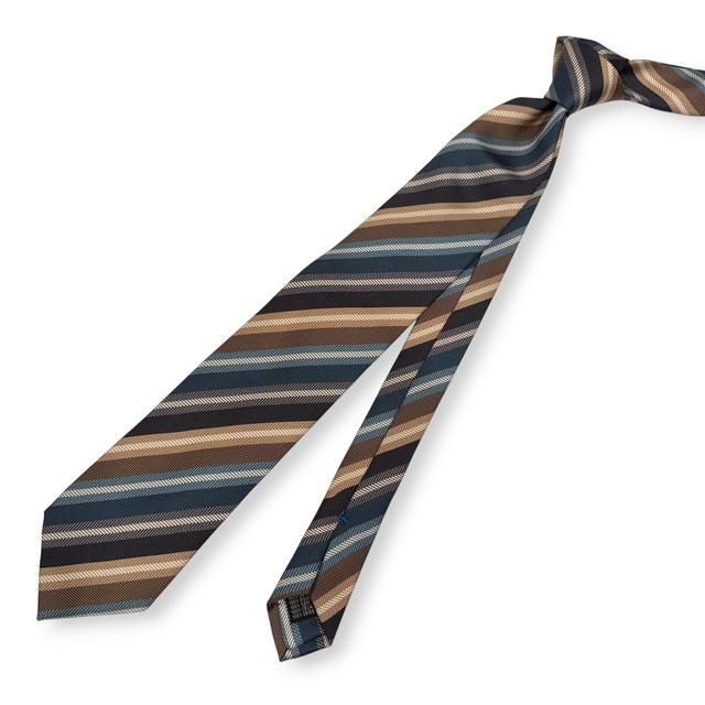 このレンジメンタルのタイは、ストライプの色ごとに、織の異なる並びが使われており、単なるストライプではなく、立体感と光沢が重なり合う独特な存在感のある一本です。
