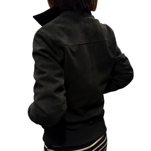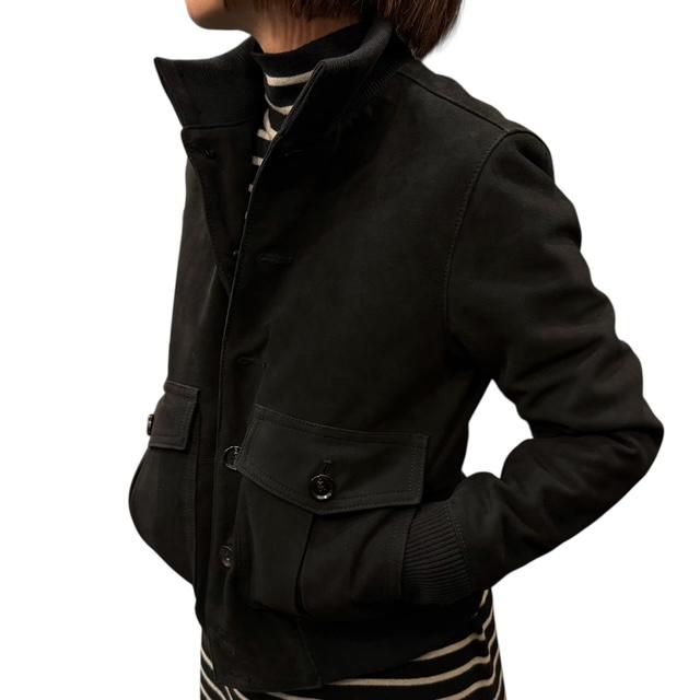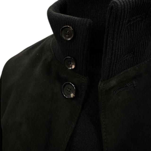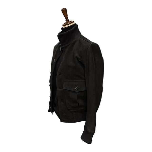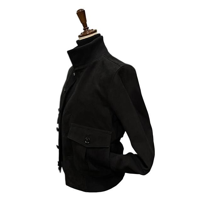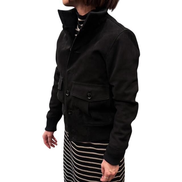 今回製作したゴートスウェード(山羊革)を使ったヴァルスターの名品ヴァルスタリーノを模したジャケットは、まさに贅を尽くした一着で、男性物では一般的に知られるヴァルスター型のジャケット(以降ヴァルスタージャケット)を、女性の身体に合わせてリデザインしたもので、革には非常に高品質でキメの細かな短毛の山羊革のスウェードを使い、ボタンは本水牛(ホーン)ボタンを、衿や袖、裾のリブは非常にしっかりとした厚みと安心感のあるパーツを採用し、この上ない一着を求めて再現しています。